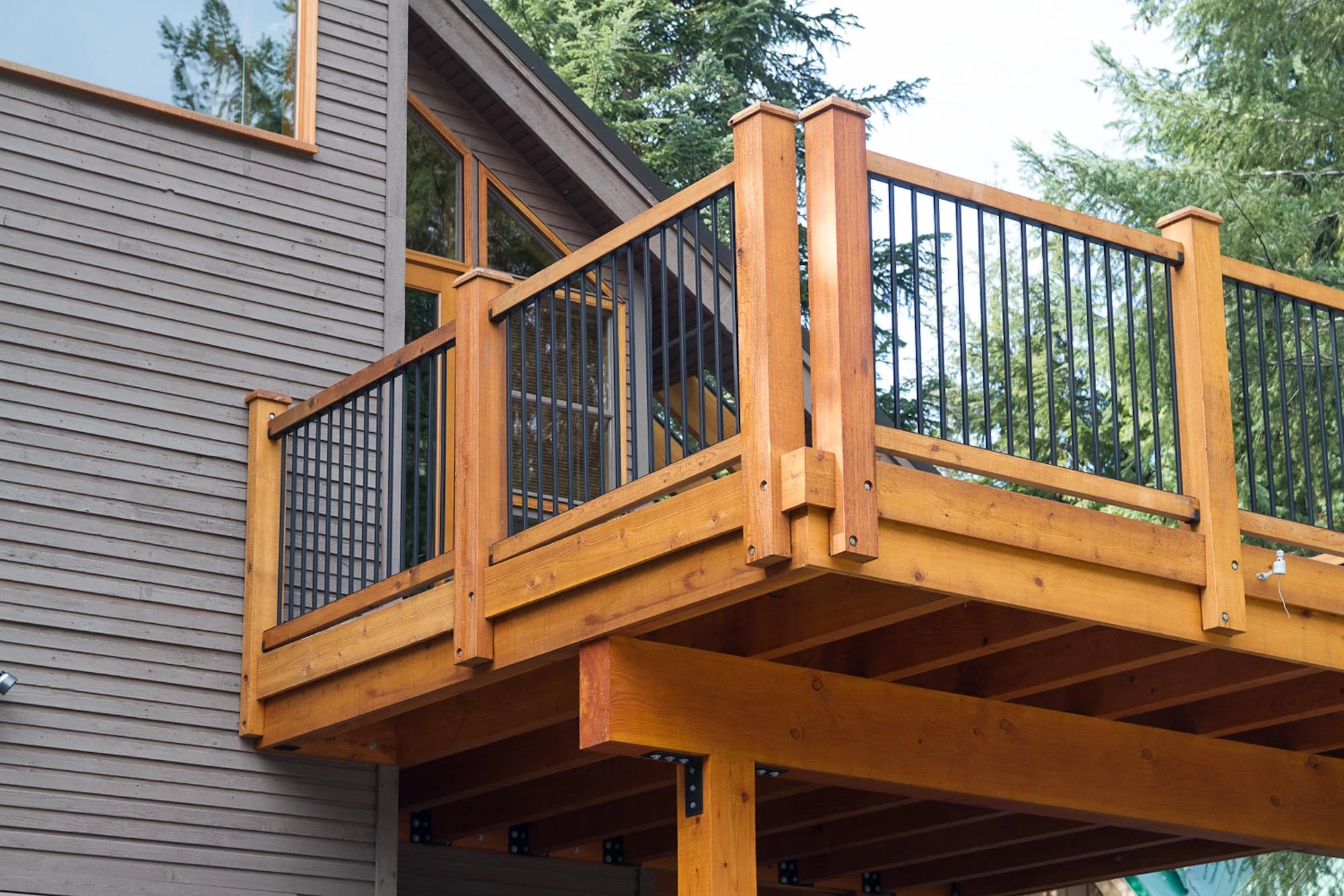 A fir post and beam carport was built with deck above that is accessed from the living room and kitchen.